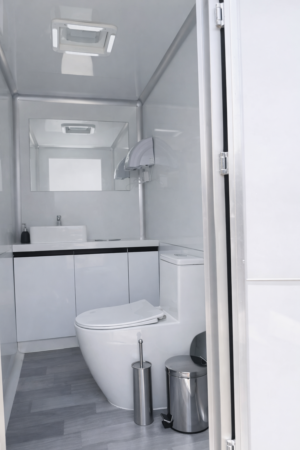 Nuestros baños trailer están diseñados para atender comodamente cada carro a 100 personas, cada baño cuenta con 2 estaciones, , cada estación cuenta con: inodoro cerámico, lavamanos con agua, secador de manos eléctrico, espejo e iluminación interior y ventilación. La estación pensada para hombres unluye un urinario. Aseguramos comodidad e higiene para los invitados durante todo el evento.